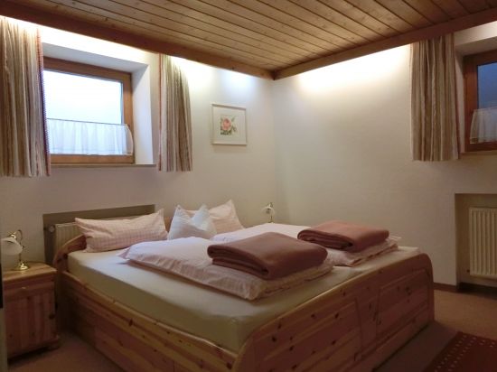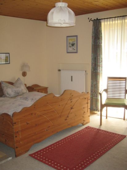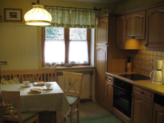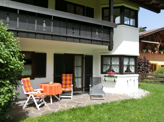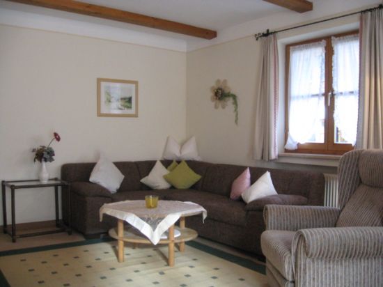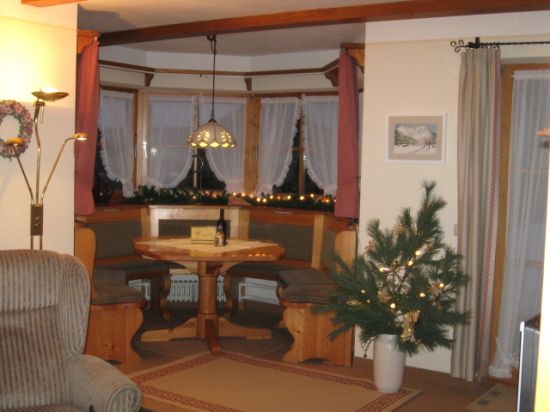 Unsere gemütliche, komfortable 100 qm große Ferienwohnung, für 1-5 Personen, mit Süd-Terrasse und herrlichem Blick auf das Zugspitzmassiv, besteht aus einem großen Wohnzimmer mit Erker, Essküche, Schlafzimmer und Bad.